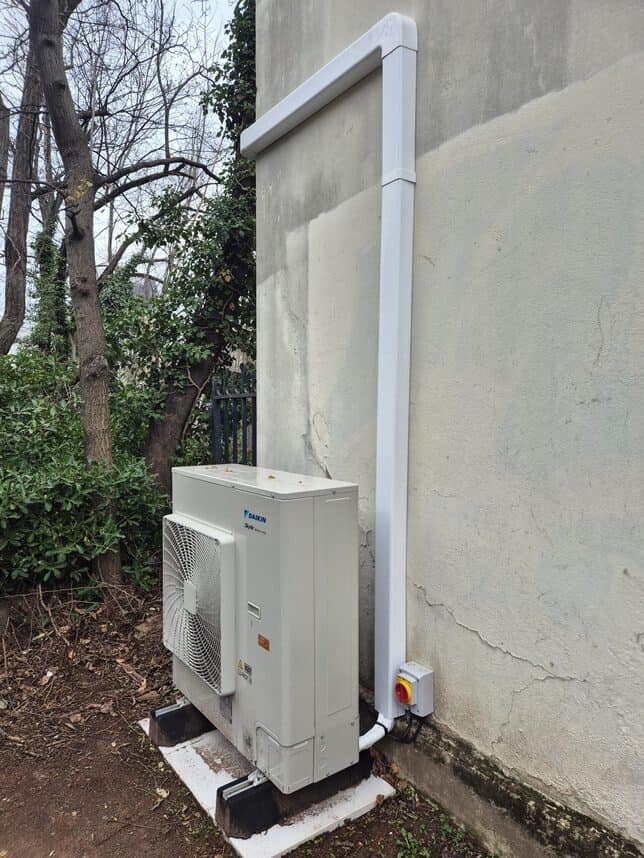 L'unité extérieure a été installée en façade extérieure du bâtiment, sur dalle béton, avec un câblage électrique soigné et un sectionneur de sécurité normalisé parfaitement visible. La tuyauterie et les câbles sont logés dans un chemin de câbles PVC blanc qui longe la façade verticalement, offrant un rendu propre et professionnel, loin des installations bâclées que l'on observe trop souvent.